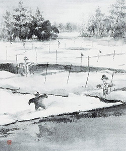 ![]() 題名「芹畑の案山子」 〈受賞者のことば〉 第53回市民展における「企業メセナ群馬賞」を受賞しとても嬉しく思いました。関係者の方々に心よりお礼申し上げます。 この作品の作成に当たり、冬の田んぼのせりの根を鳥が啄いばんでしまうので、鳥よけの為に案山子を立てる事を知りました。それをきっかけに子供の頃あっちこっちの田んぼや畑にいっぱいの案山子を立てていた事を想い出しその情景を画いてみました。子供の頃の私には鳥や獣を威す為の人形だとは認識も無く、実りの時季になると田んぼや畑に、おかしなおじさんの案山子やかっぽう着のお母さんの案山子をみんなで見に行くのが楽しみでした。一筆ごとに懐しい心が蘇りました。 絵を描くことにより社会とも強くかかわりを持てる事も張り合いとなっています。これからも心に残る作品を画き続けたいと思います。 |